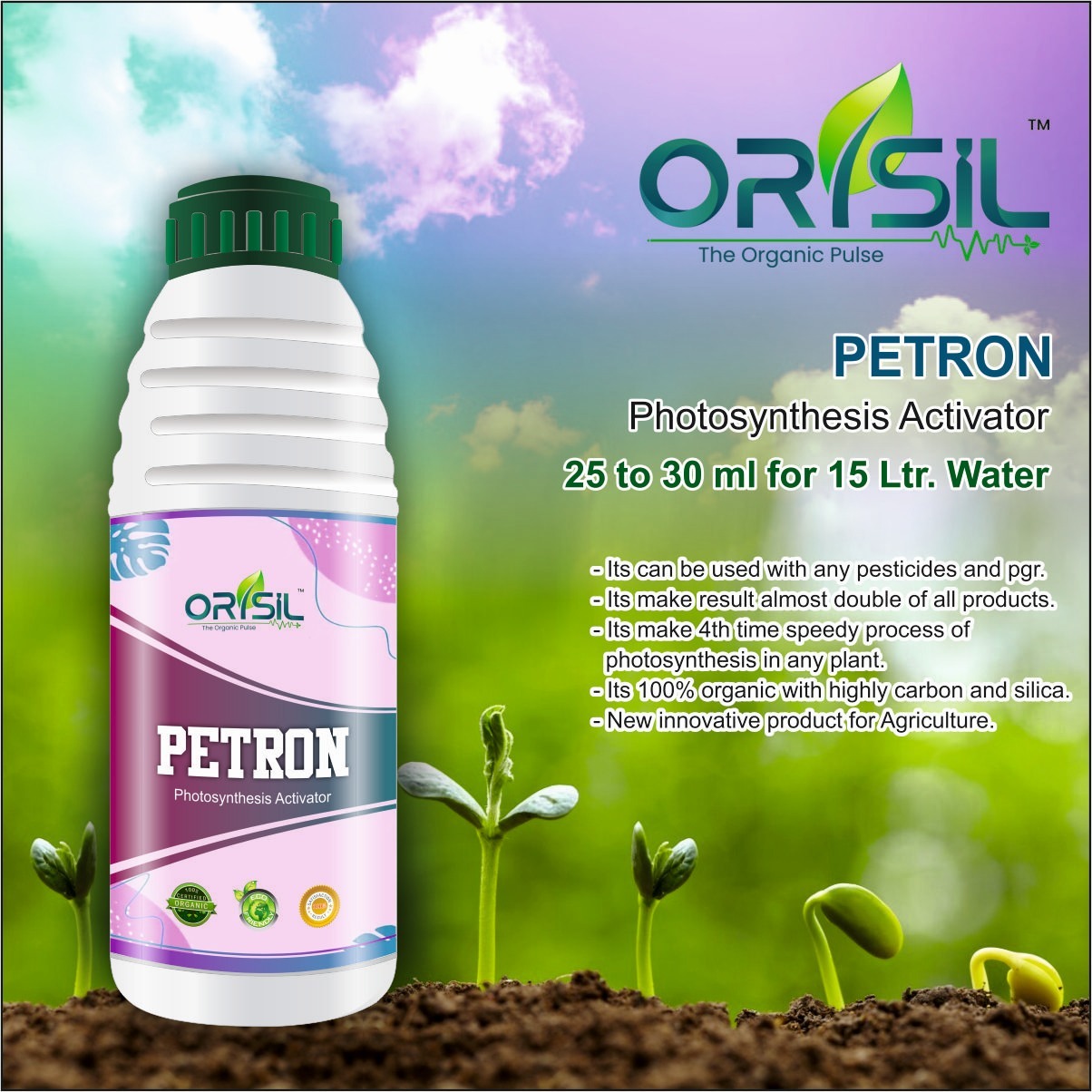 PETRON is a mineral yield stimulant. It contains unique molecule carbon and silica– bioavailable, organic carbon compound. Carbon and Silica is effectively uptaken by plants, positively affecting their growth and development as well as seed and fruit setting, what increases yield. The main benefits of using PETRON are: – greater biomass increase due to intensification of photosynthesis (through higher chlorophyll content as a result of increased Fe ions activity) – increased effectiveness of pollination process due to improvement of pollen vitality and pollen germination on stigma (more effective seed and fruit setting) – improved plant nutritional status due to increased nutrient uptake from soil – improved plant vigor