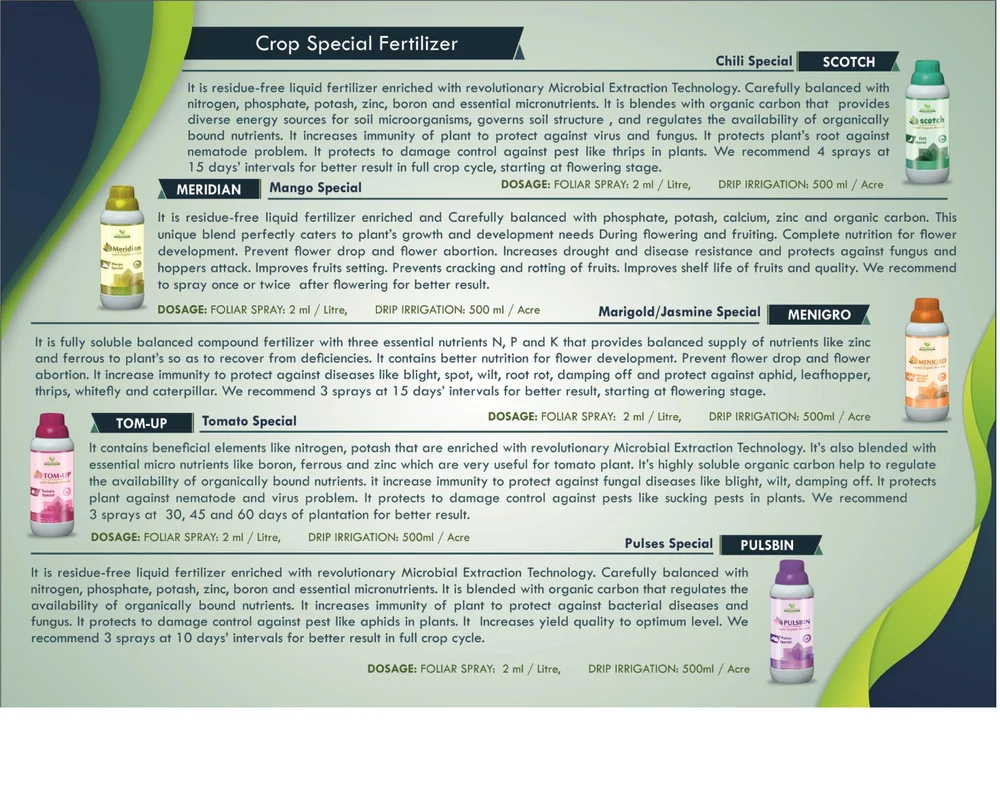 It is fully soluble balanced compound fertilizer with three essential nutrients N, P and K that provides balanced supply of nutrients like zinc and ferrous to plant’s so as to recover from deficiencies. It contains better nutrition for flower development. Prevent flower drop and flower abortion. It increase immunity to protect against diseases like blight, spot, wilt, root rot, damping off and protect against aphid, leafhopper, thrips, whitefly and caterpillar. We recommend 3 sprays at 15 days’ intervals for better result, starting at flowering stage. DOSAGE: FOLIAR SPRAY: 2 ml / LitreDRIP IRRIGATION: 500 ml / Acre